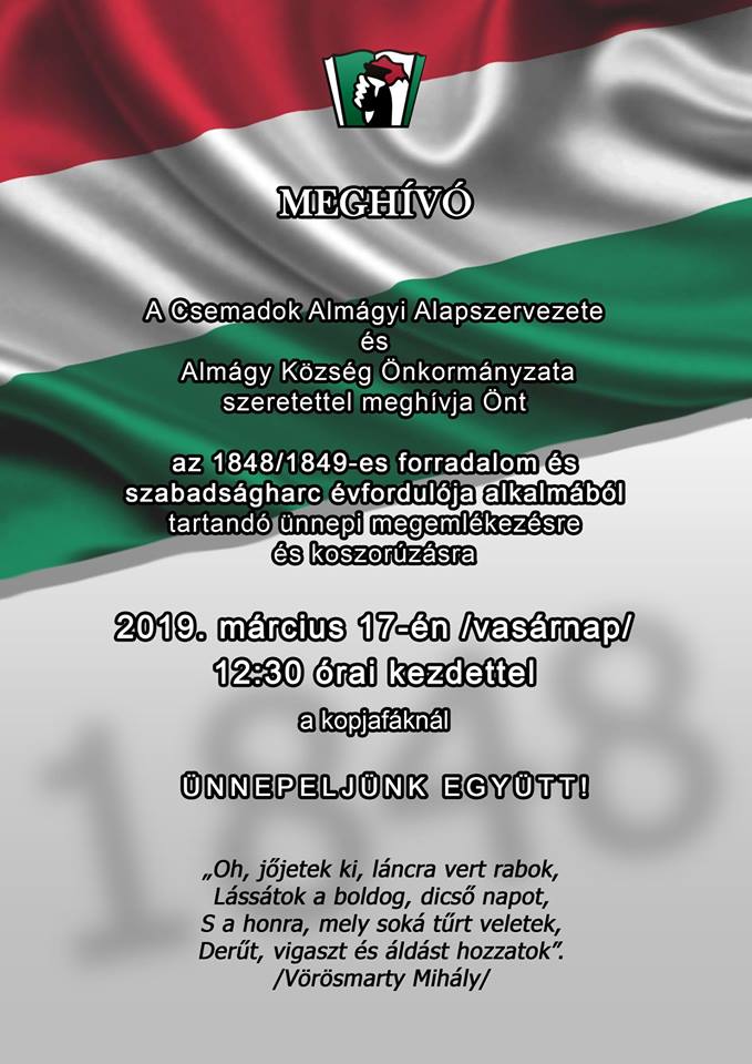 1. Március 17-én (vasárnap) 12:30 órakor Almágyban is tartanak koszorúzást és megemlékezést.