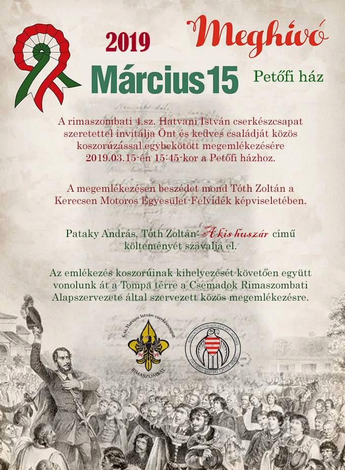 A Csemadok Tornaljai Területi Választmánya és Alapszervezete az 184849-es magyar forradalom és szabadságharc 171. évfordulója tiszteletére megemlékezést rendez 2019. március 15-én, pénteken 16:00 órai kezdettel Tornalján.