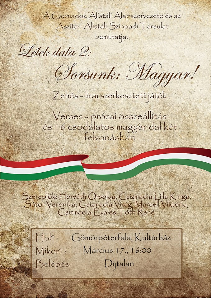 A Csemadok Alistáli Alapszervezete és a mellette működő ASziTA Társulat tisztelettel meghívja Önöket Sorsunk: Magyar! című előadására! Helyszín: Gömörpéterfala, kultúrház.