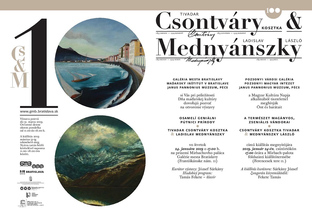 Január 24-től március 31-ig látogatható a Pozsonyi Városi Galériában (Mirbach-palota, Ferencesek tere 11.) a Csontváry Kosztka Tivadar és Mednyánszky László festőművész halálának centenáriuma alkalmából rendezett kiállítás. Március 20-án, szerdán 17.00 órától Kiss-Szemán Zsófia művészettörténész, a Pozsonyi Városi Galéria főkurátora tart tárlatvezetést. Belépő 2 euró. A program szlovák nyelvű.