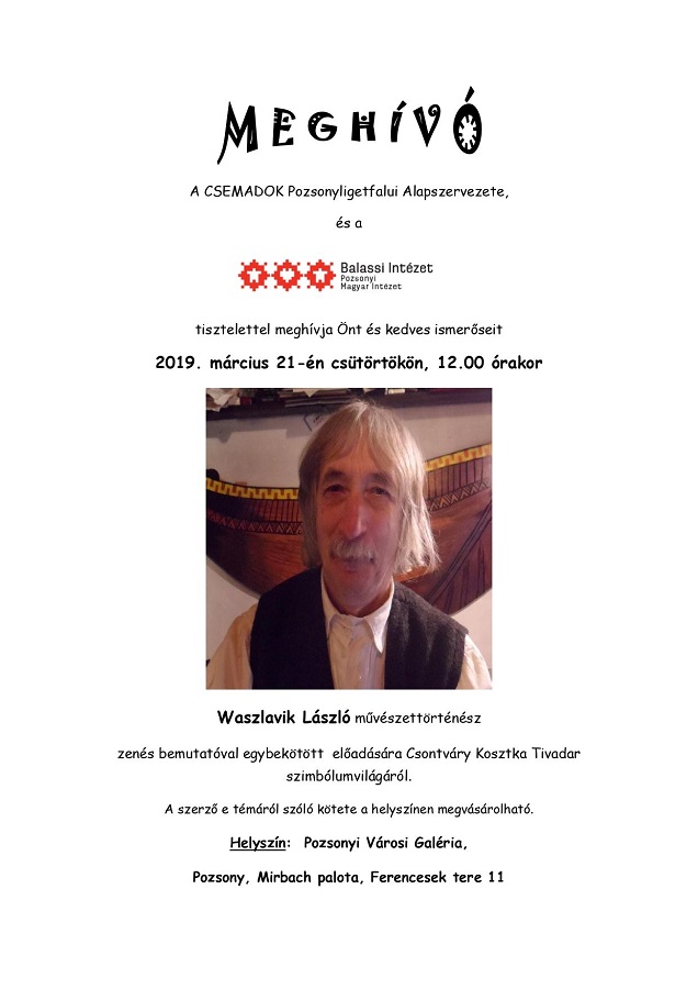 A Csemadok Pozsonyligetfalui Alapszervezete és a Pozsonyi Magyar Intézet minden érdeklődőt tisztelettel meghív Waszlavik László művészettörténész zenés bemutatóval egybekötött előadására, amelyen Csontváry Kosztka Tivadar szimbólumvilágát fogja bemutatni. Az eseményre március 21-én, csütörtökön 12.00 órakor kerül sor a Pozsonyi Városi Galéria épületében (Mirbach-palota).
