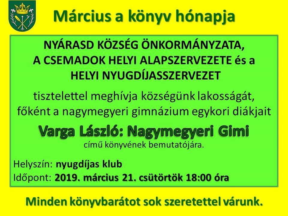 Nyárasdon március 21-én, csütörtökön 18.00 órától könyvbemutatót tartanak.