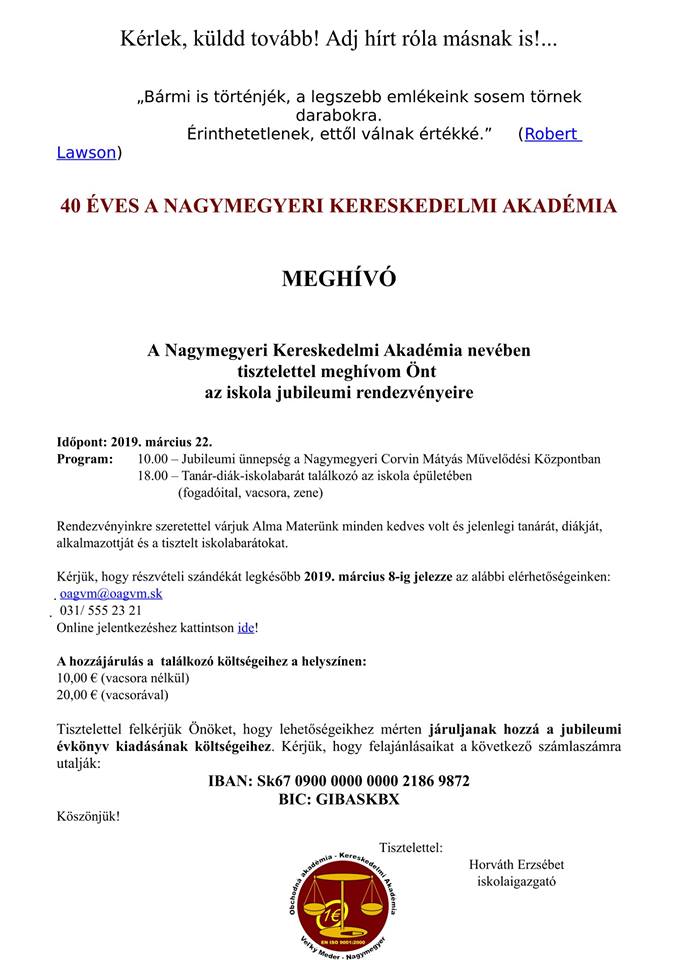 Nagymegyeren máricus 22-én, pénteken 10.00 órától tartják a Nagymegyeri Kereskedelmi Akadémia jubileumi ünnepségét.