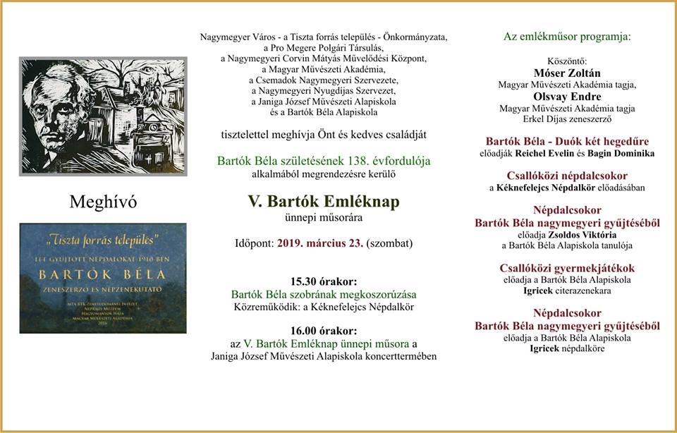Nagymegyeren március 23-án, szombaton 15.30-tól rendezik meg az V. Bartók Emléknapot.