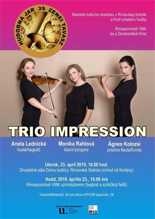Az Impression koncertjével folytatódik a 39. Zenei Tavasz Rimaszombatban. A három hölgy, a rimaszombati Kolozsi Ágnes (fuvola), a turócszentmártoni Aneta Lednická (hegedű) és az eperjesi Monika Rahlová (zongora) a pozsonyi Művészeti Egyetem végzős növendékei, repertoárjuk pedig a barokktól a klasszicizmuson át a 20. század zenéjéig terjed.