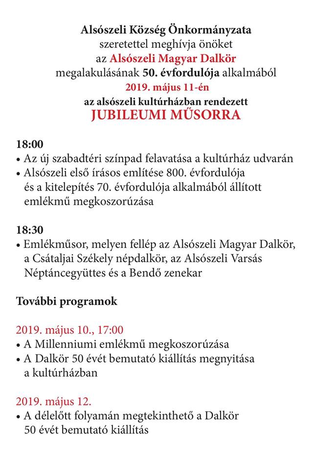 Alsószeliben május 11-én, szombaton 18.00 órakor jubileumi műsor kezdődik.