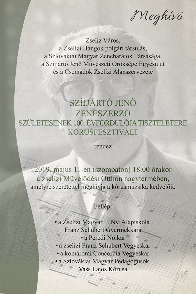 Május 11-én Zselízen Szíjjártó Jenő születésének 100. évfordulója alkalmából kórusfesztivált szerveznek. Helyszín: zselízi Művelődési Otthon.