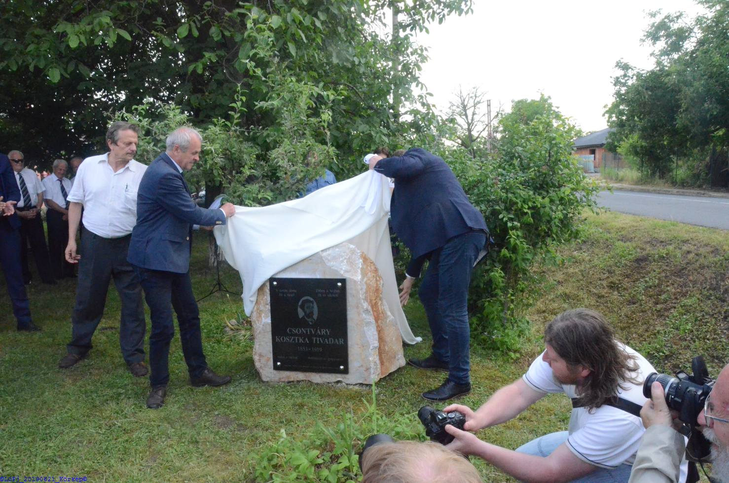 A szervezők felkérésének eleget téve az emléktáblát közösen leplezték le. A szomszédos tugári mészkőbányából kapott kőtömbre helyezett fekete márványtáblán a gyógyszertárban készült Önarckép részlete mellett ettől a pillanattól kezdve szlovák-magyar nyelvű felirat hirdeti, hogy „Ebben a házban élt és alkotott Csontváry Kosztka Tivadar gyógyszerész és festőművész 1853-1919”.