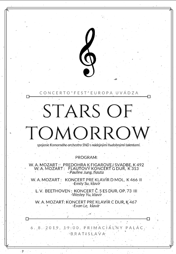 Mindenkit sok szeretettel várnak augusztus 6-án, kedden 19.00 órakor a pozsonyi Prímási palota tükörtermében megrendezésre kerülő szólókoncertekre. A rendezvény a Concerto*Fest*Europa nonprofit szervezet kurzusainak és workshopjainak záróestje, amit idén immáron harmadszor rendezett meg Robert Ward, a Los Angeles-i egyetem professzora és karmestere. A belépés díjtalan.