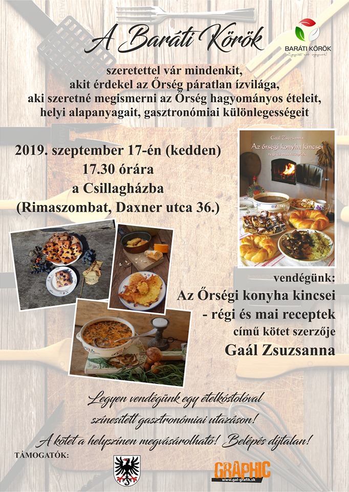 Szeptember 17-én, kedden 17:30 órakor Rimaszombatban, a Csillagházban Az Őrségi Konyha Kincsei címmel tartanak előadást.