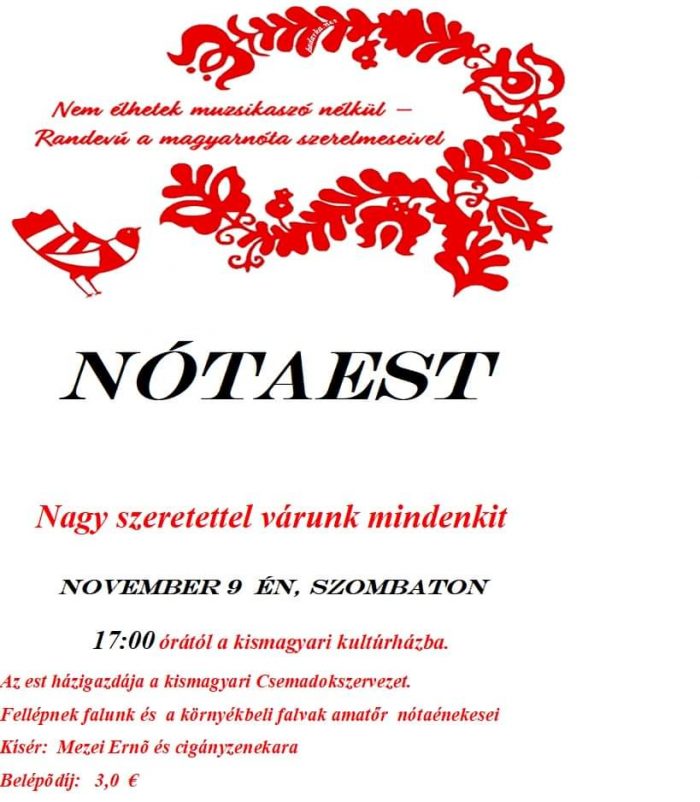 Kismagyaron november 9-én, szombaton 17.00 órától nótaestet tartanak.
