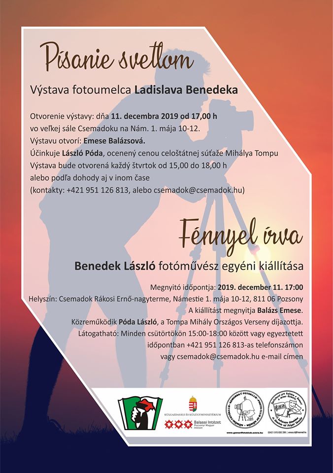 December 11-én, szerdán 17.00 órakor nyílik meg Benedek László fotóművésznek, a Gömöri Fotóklub elnökének egyéni kiállítása a Csemadok Rákosi Ernő-nagytermében (Május 1. tér 10–12.).