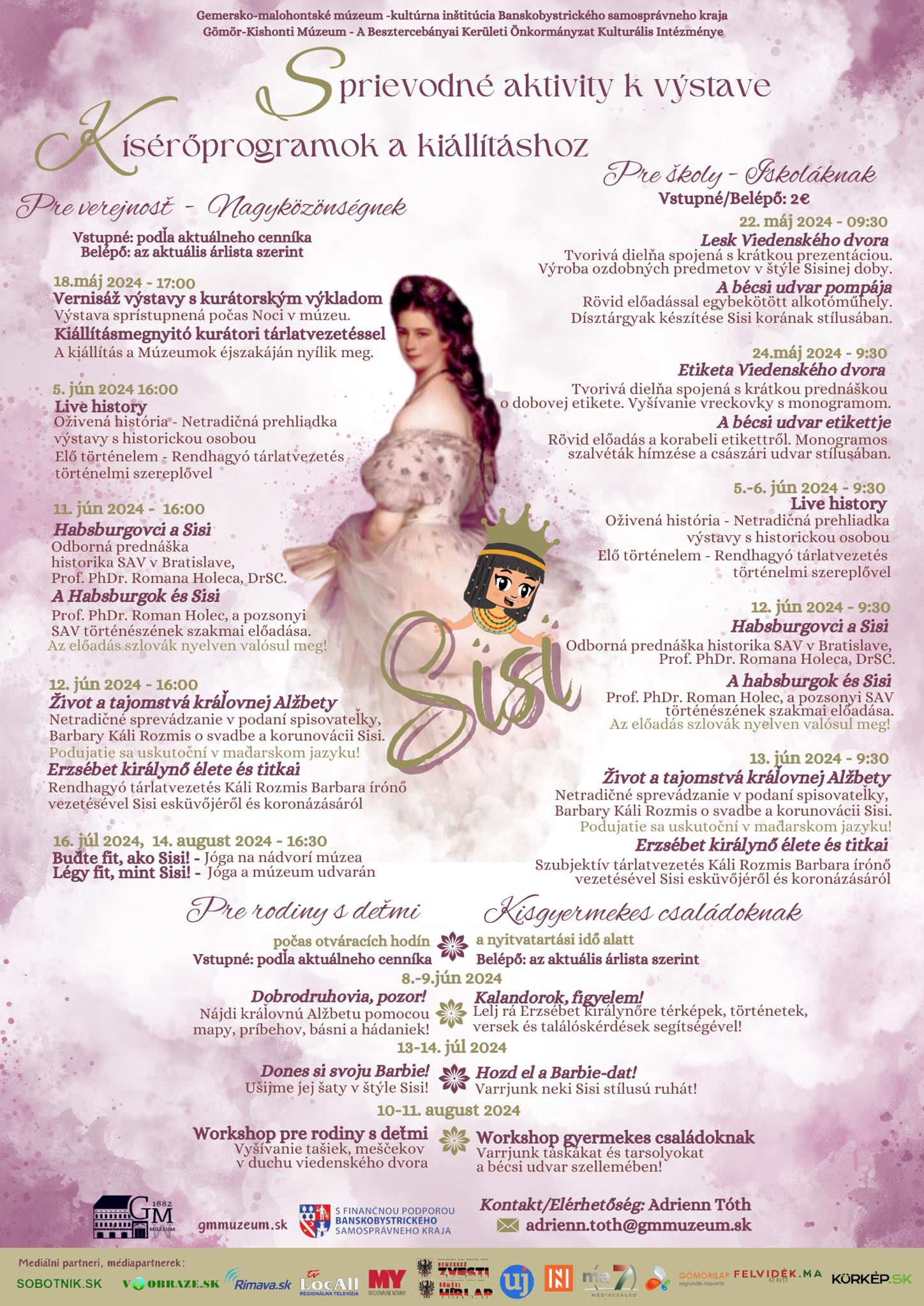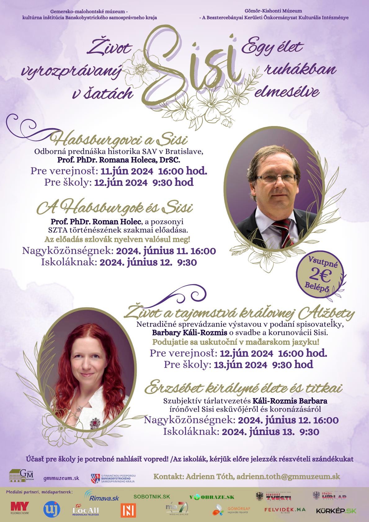 Június 11-én, 12-én és 13-án Sisi és korának két kimagasló ismerője, Roman Holec történész, a Szlovák Tudományos Akadémia munkatársa, és a Sisivel kapcsolatos bestseller-könyvek szerzője, Káli-Rozmis Barbara tart majd előadást és szubjektiv tárlatvezetés „Sisi és a Hanbsburgok“ valamint „Erzsébet királyné élete és titkai“ címmel.