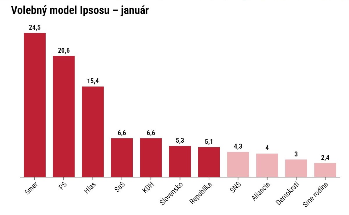 Továbbra is Robert Fico pártja a legnépszerűbb az országban, derül ki az IPSOS legfrisebb, január végi választási modelljéből.
