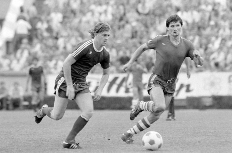 Törőcsik András (balra) kapura tör Váradi Ottó mellett az Újpesti Dózsa-Diósgyőri VTK NB I-es labdarúgó-mérkőzésen, a Megyeri útonFORRÁS: MTI/NÉMETH FERENC
