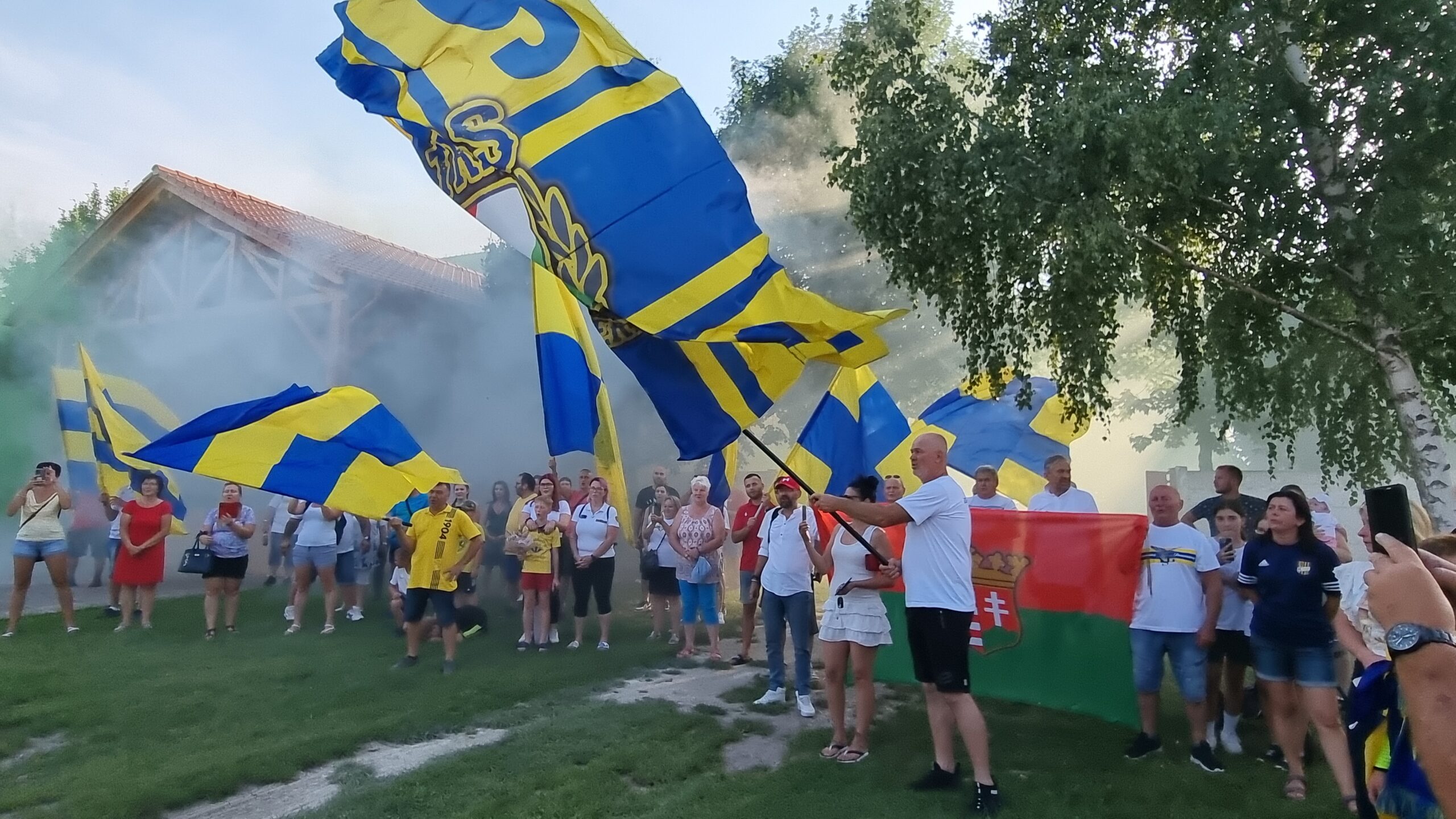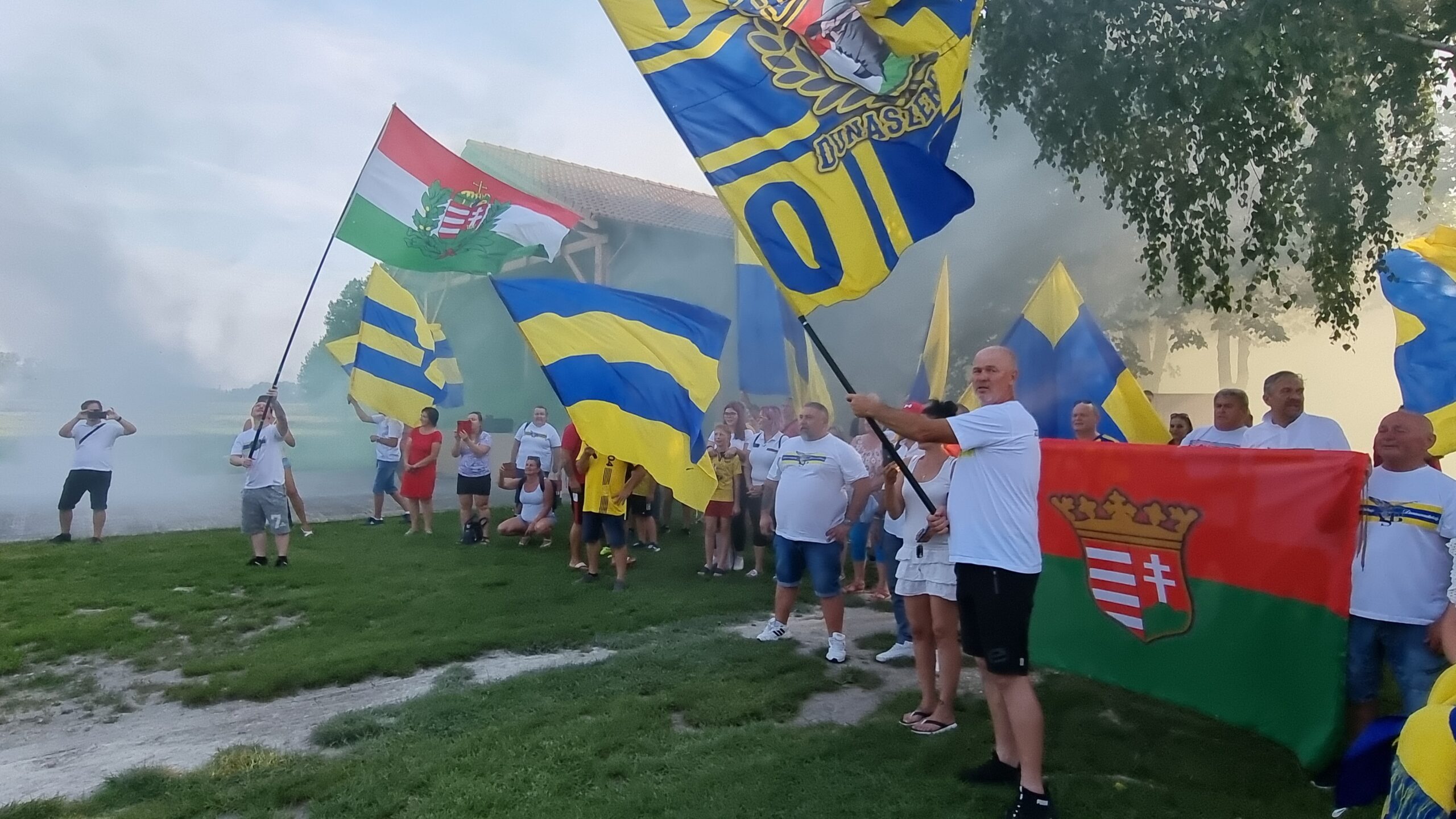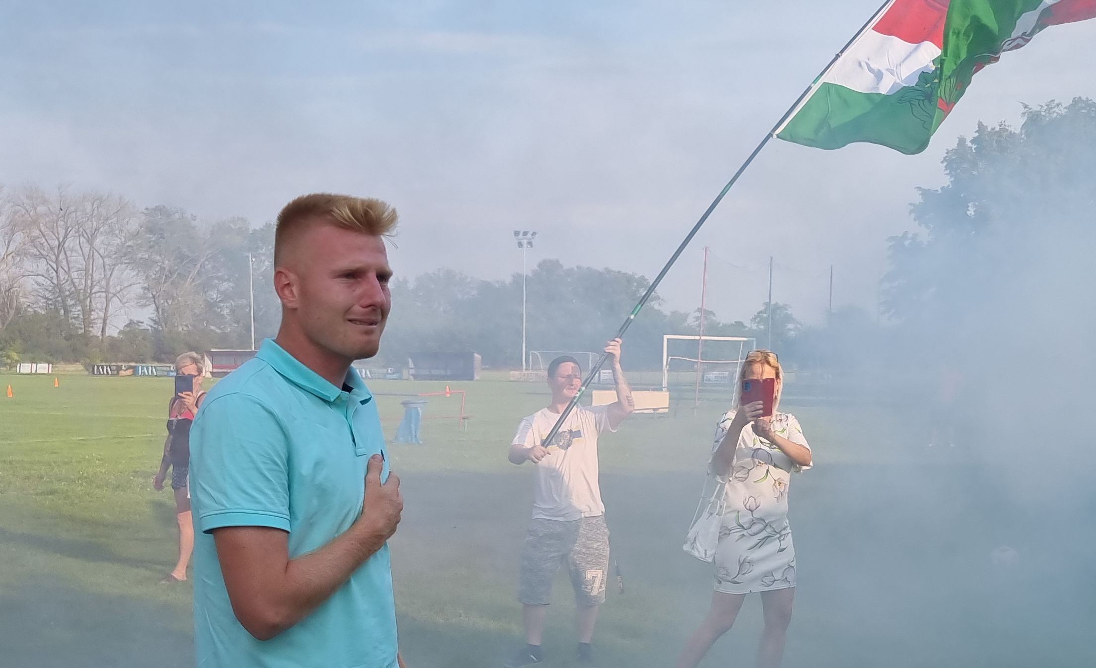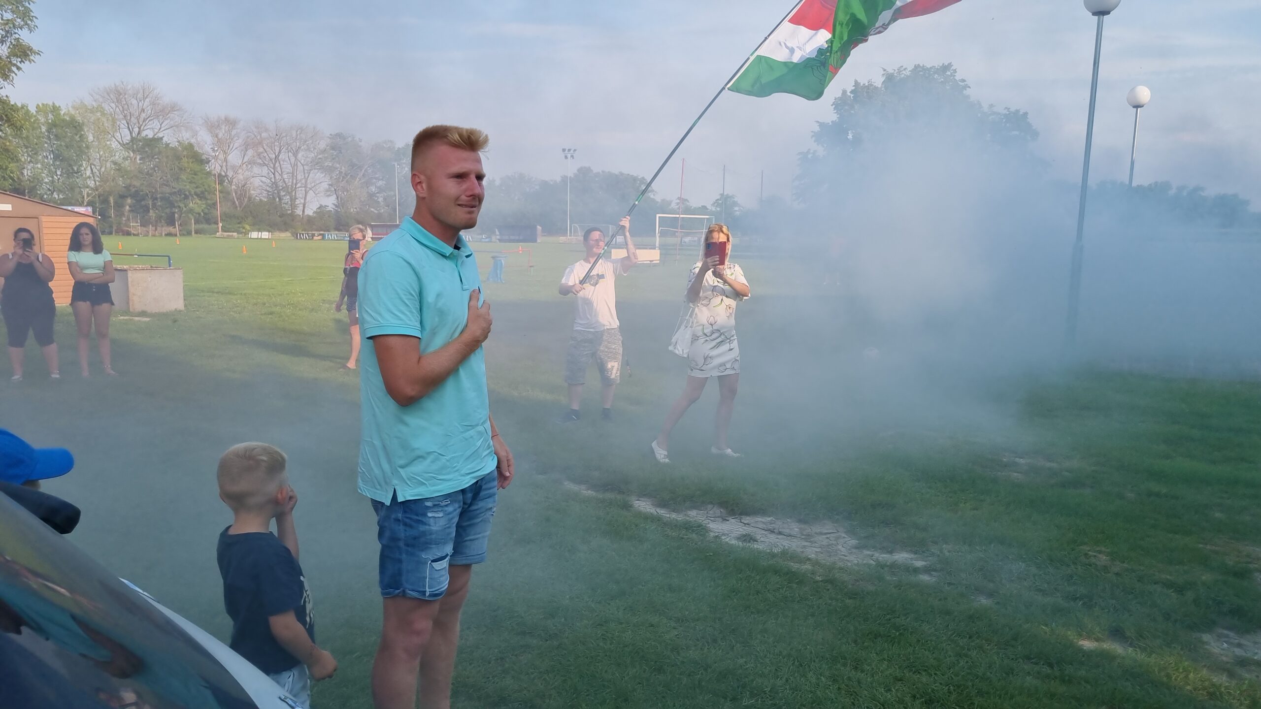 Sűrű díszsorfal fogadta a Balony község sportályája felé vezető úton lassan begördülő fehér gépkocsit. A sárga-kék zászlóerdő, füstbombák, fáklyák között Kalmár Zsolt érkezett feleségével és családjával.