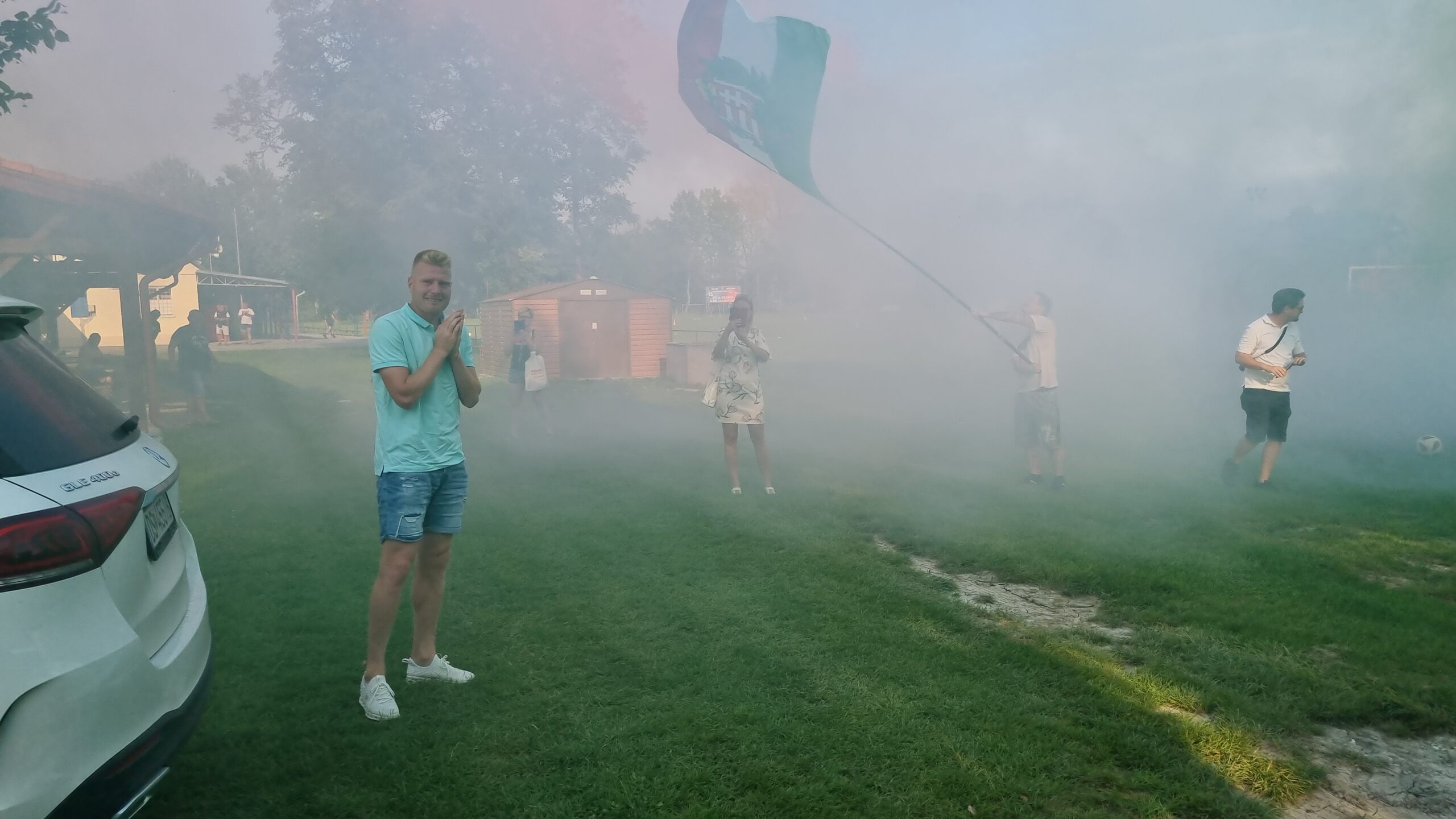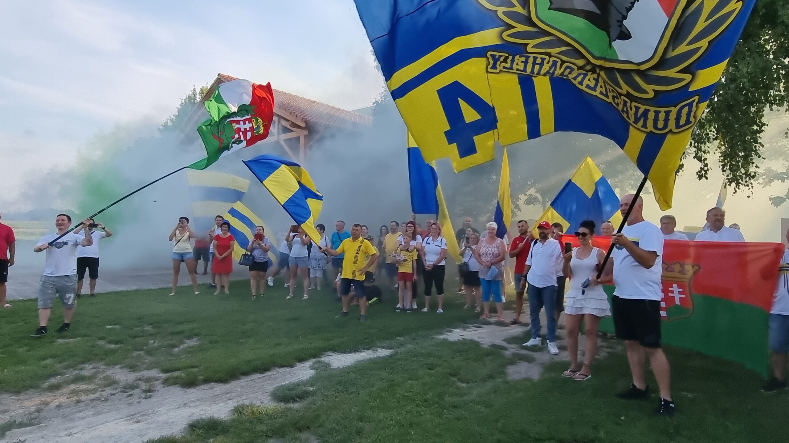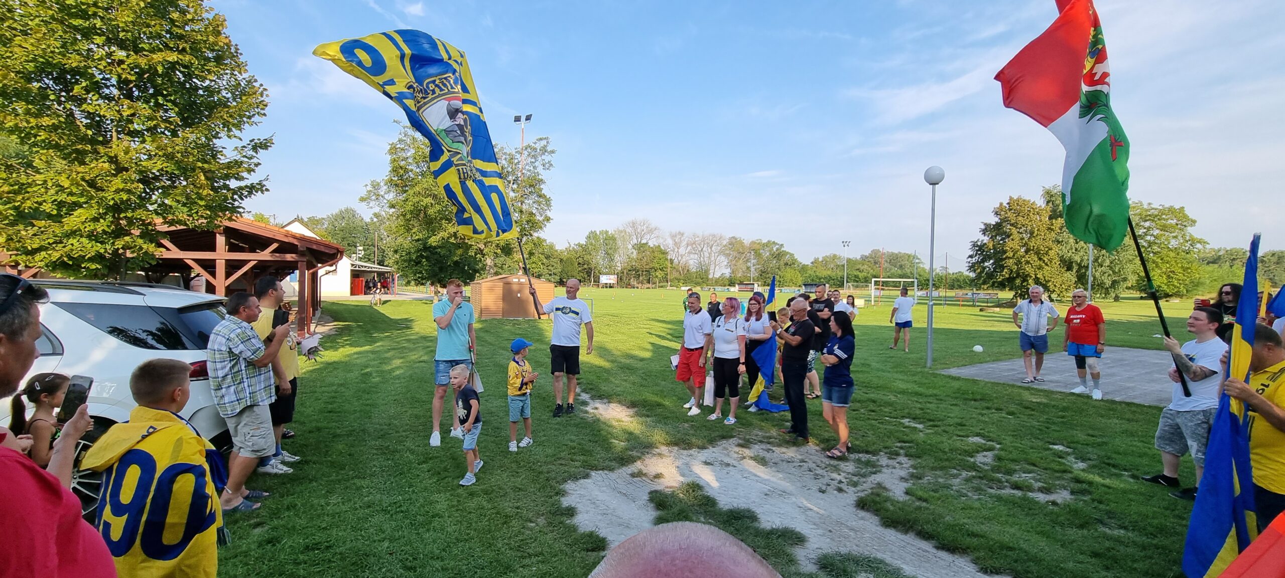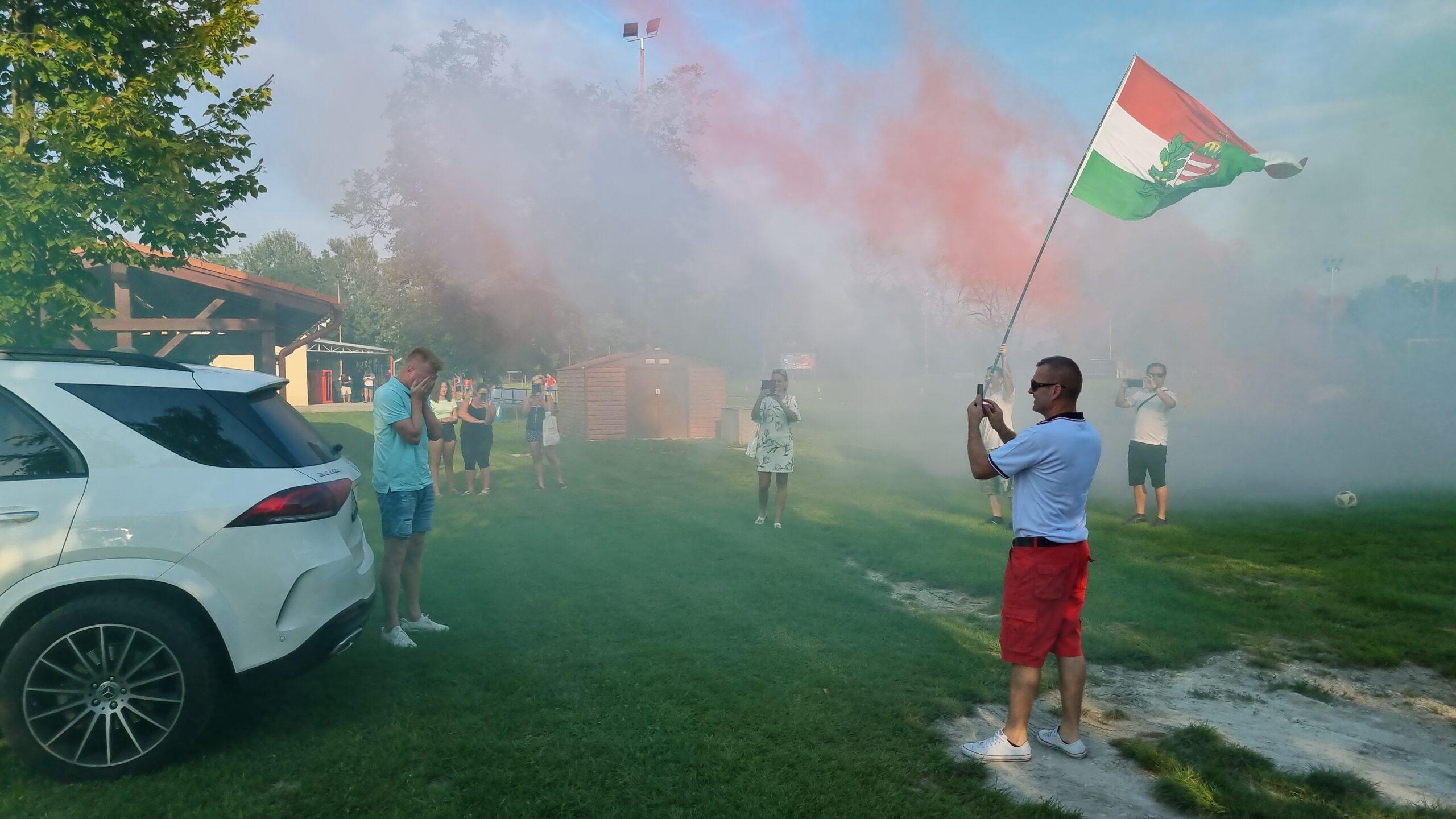 Sűrű díszsorfal fogadta a Balony község sportályája felé vezető úton lassan begördülő fehér gépkocsit. A sárga-kék zászlóerdő, füstbombák, fáklyák között Kalmár Zsolt érkezett feleségével és családjával.