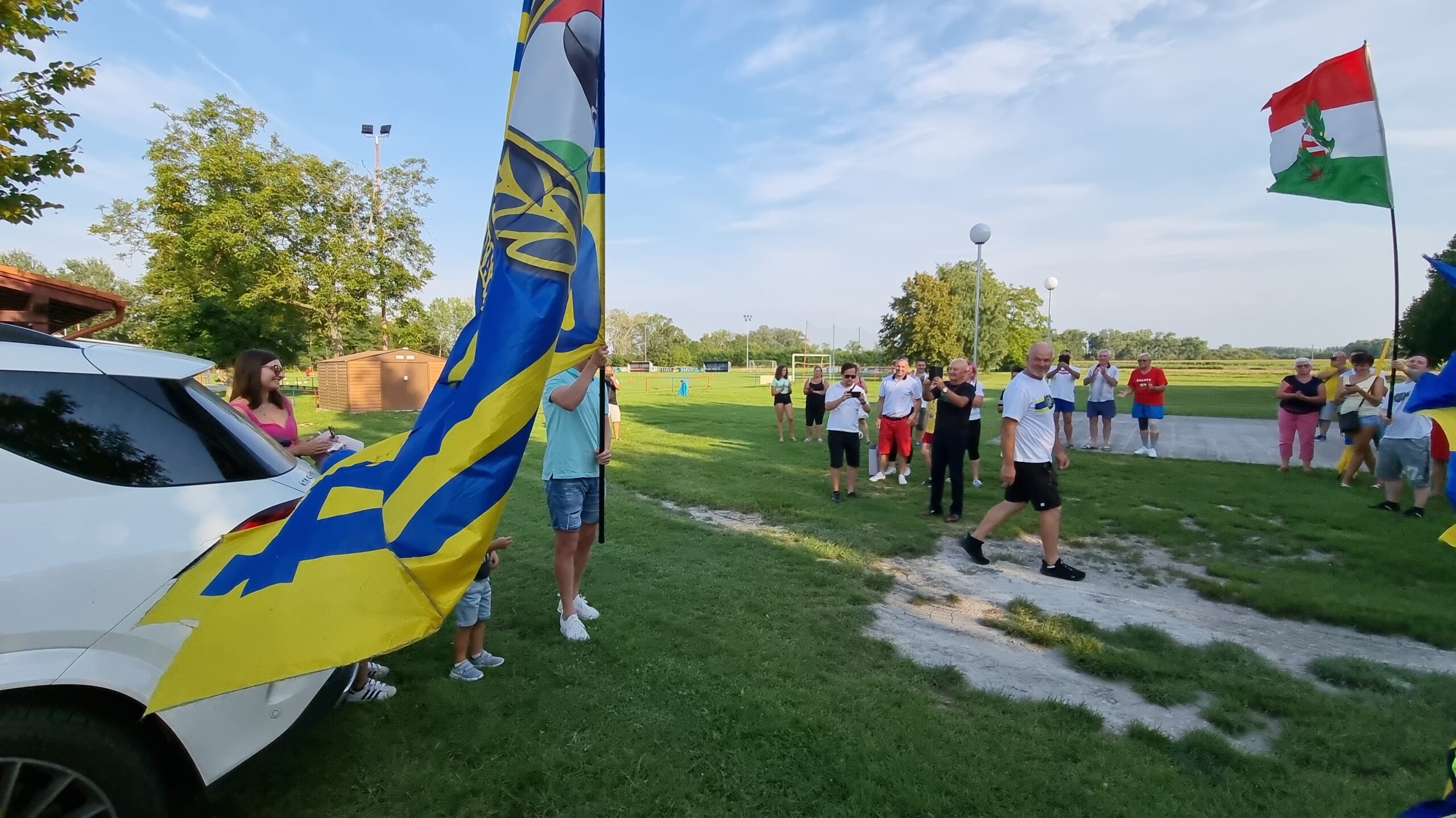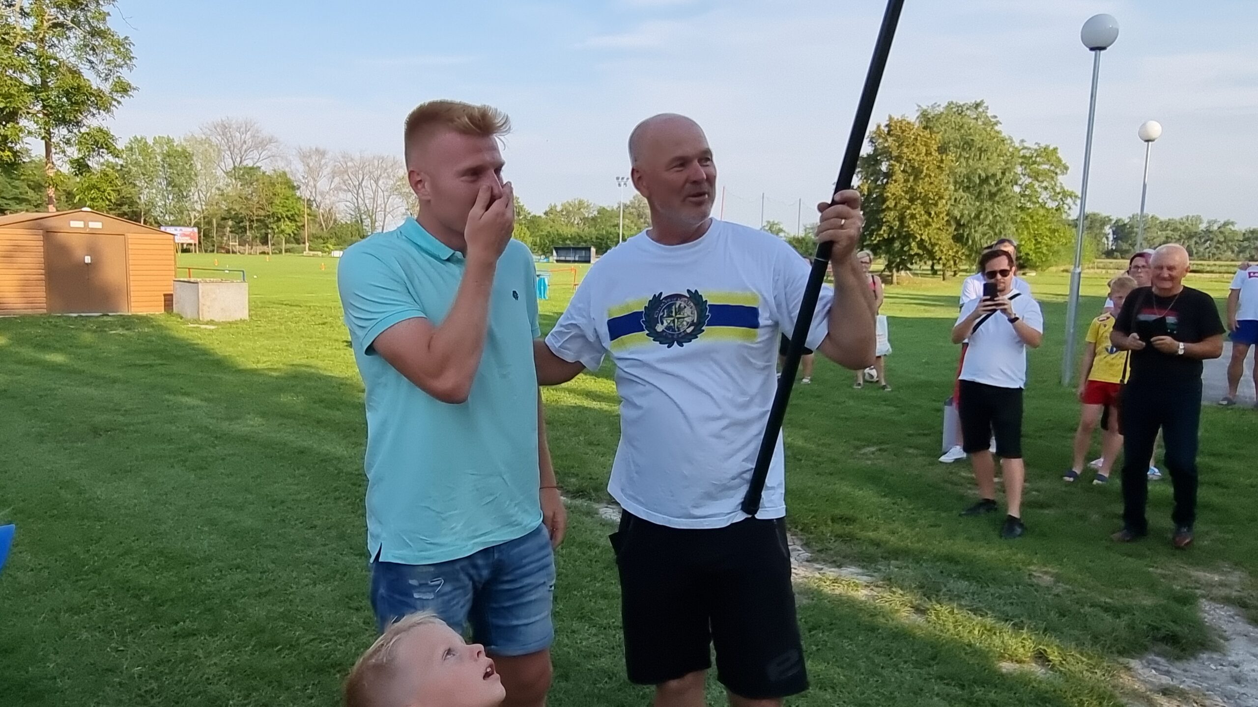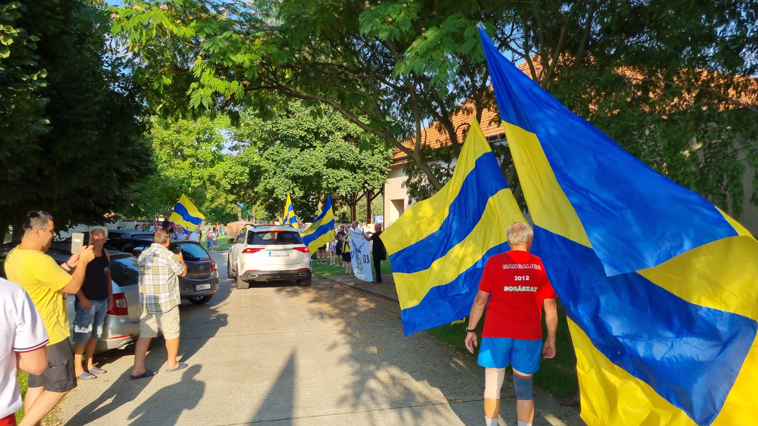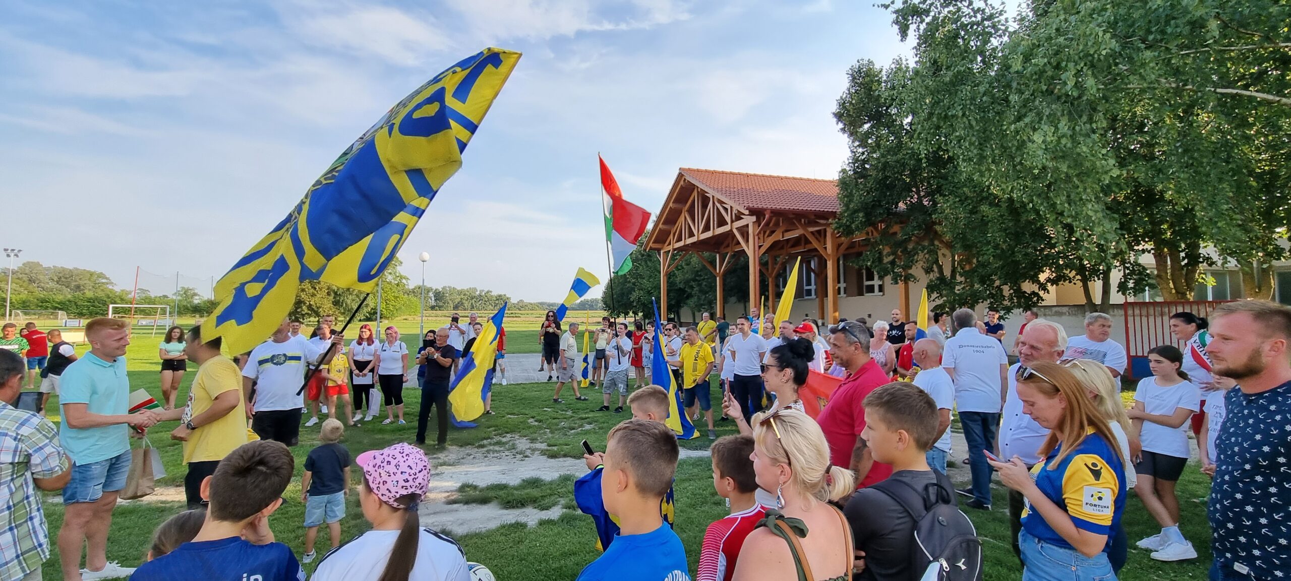 Sűrű díszsorfal fogadta a Balony község sportályája felé vezető úton lassan begördülő fehér gépkocsit. A sárga-kék zászlóerdő, füstbombák, fáklyák között Kalmár Zsolt érkezett feleségével és családjával.