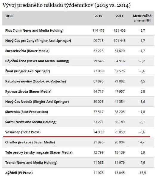 2014-hez képest a tavalyi évben 3,6 százalékkal esett vissza a Vasárnap hetilap eladott példányszáma. Ez kevesebb, mint a teljes szlovákiai hetilap-piac visszaesése, mely 4,7 százalék.