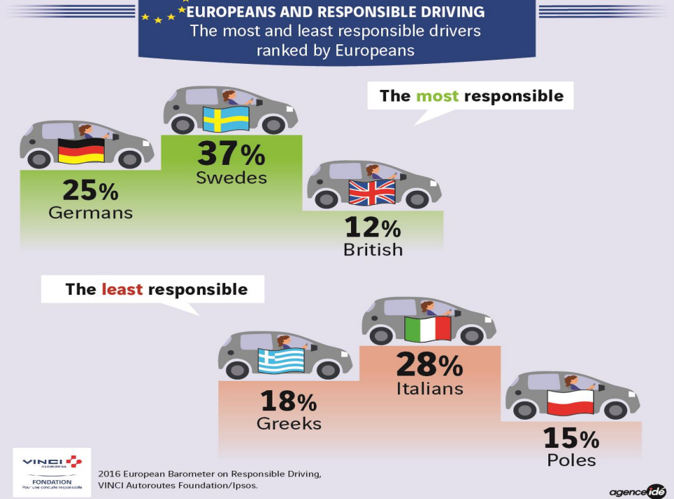 A felmérés tanúsága szerint a legfelelősségteljesebb sofőrök a svédek, a második helyen végeztek a németek, dobogós harmadikok pedig a britek. A legfelelőtlenebb sofőrök Olaszországban vannak, Görögországban illetve Lengyelországban.