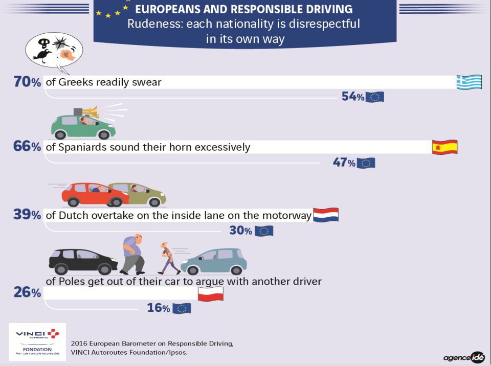 A sofőrök habitusát is megpróbálták felmérni. A legkirívóbb eseteket az alábbi ábra próbálja bemutatni. Ebből az látszik, hogy a görög sofőrök veszik legkönnyebben szájukra a másik sofőr felmenőinek a nevét, és a spanyolok használják leggyakrabban indokolatlanul a dudát. A dánoknál fordul elő leggyakrabban, hogy a belső sávban előznek az autópályán. A lengyeleknél a legnagyobb a száma azoknak a sofőröknek, akik az autóból kiszállva „beszélik” meg a másik sofőrrel a nézeteltérést.