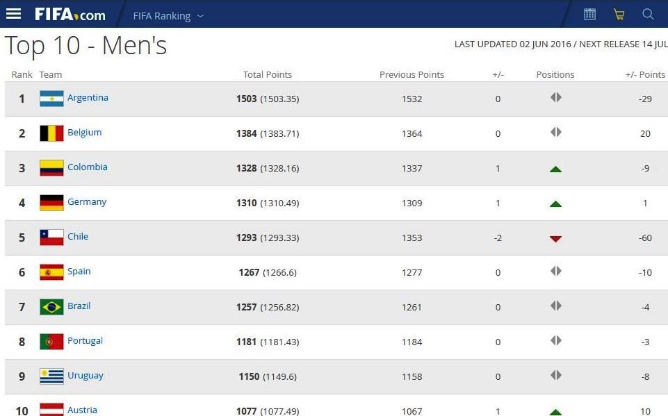 Az élen változatlanul Argentína áll Belgium előtt, a chileiek viszont két hellyel lejjebb csúsztak, így most ötödikek, harmadiknak Kolumbia jött fel. A világbajnok németek – a magyarok szombati Eb-felkészülési ellenfelei – egy helyet javítva a negyedikek.