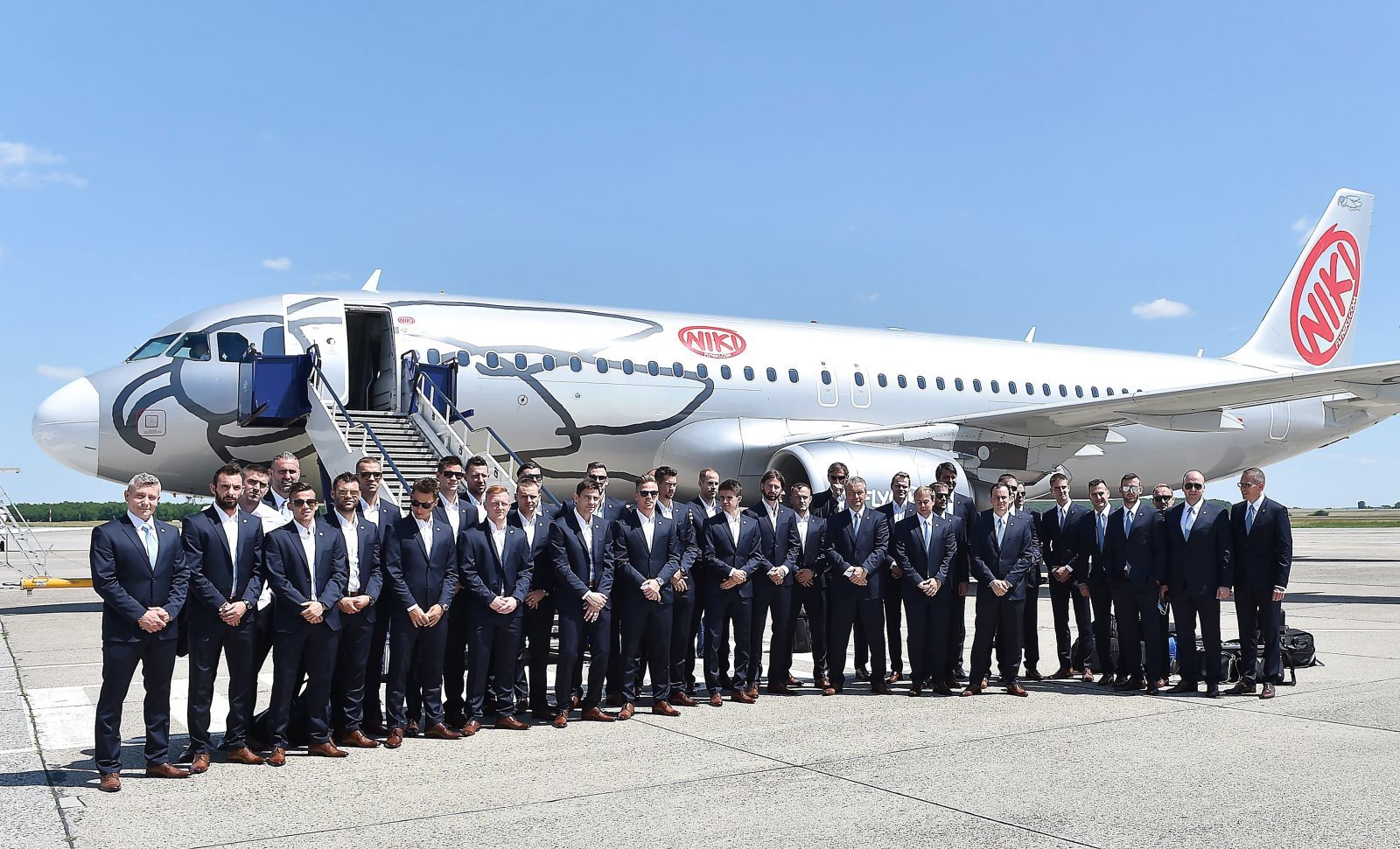A magyar válogatott a FlyNiki légitársaság gépével indult el Nizzába kedden 11.40-kor, a légitársaság tulajdonosa Niki Lauda Forma-1-es világbajnok egykori versenyző. Nizzából a Terre Blanche-ban lévő bázisra utazik majd a csapat, az első meccsét június 14-én, kedden játssza Bordeaux-ban Ausztria ellen.
