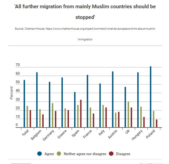 Leginkább a magyarok ellenzik a muszlim bevándorlást: 72 százalékuknak volt negatív véleményük a muszlimokról. Az olaszok 69, a lengyelek 66, a görögök 65 és a spanyolok 50 százaléka volt hasonló véleményen. Nagy-Britanniában csak a megkérdezettek 28 százaléka viseltetett negatívan a muszlimokkal szemben, míg Németországban és Franciaországban 29 százalék mondta ugyanezt.