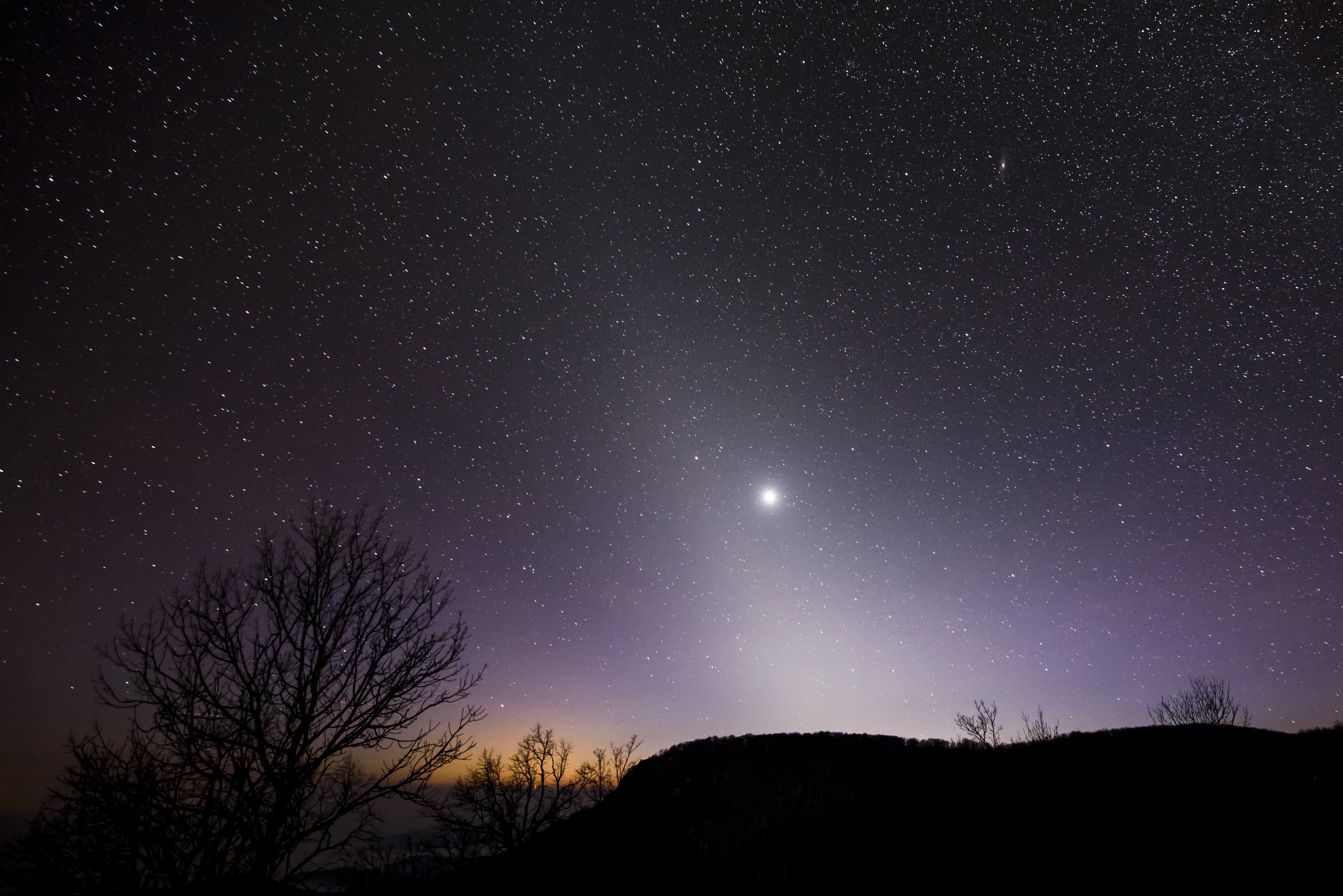 Az állatövi fény és a Vénusz látszik a Három-kõ csúcsáról a Bükk-fennsíkon Felsõtárkány közelében 2017. február 16-án. Az állatövi fényt a bolygóközi porfelhõrõl visszaverõdõ napfény okozza. A jelenséget a mérsékelt övi területekrõl február-márciusban napnyugta után, illetve szeptember-októberben napkelte elõtt lehet megfigyelni.