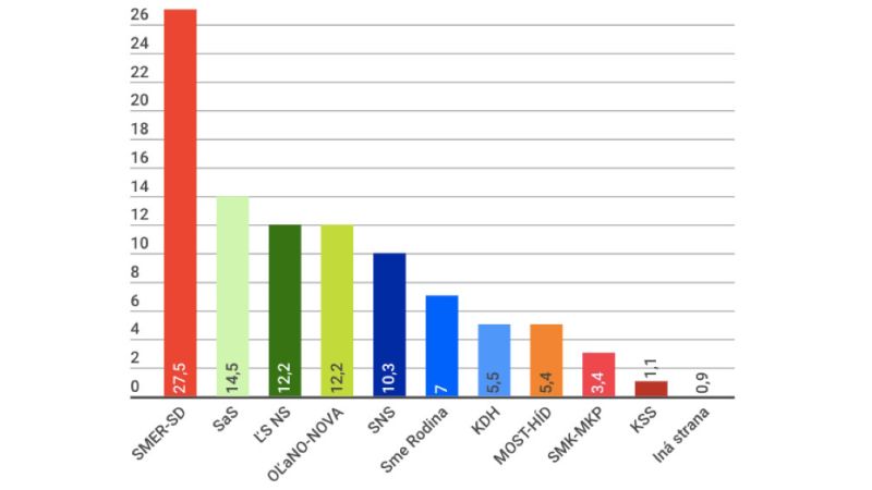 A Smer-SD nyerne 27,5 százalékkal, de koalíciós partnereivel együtt nem lenne meg a kormányzáshoz szükséges többség – legalábbis ez derül ki a Polis legújabb felméréséből.