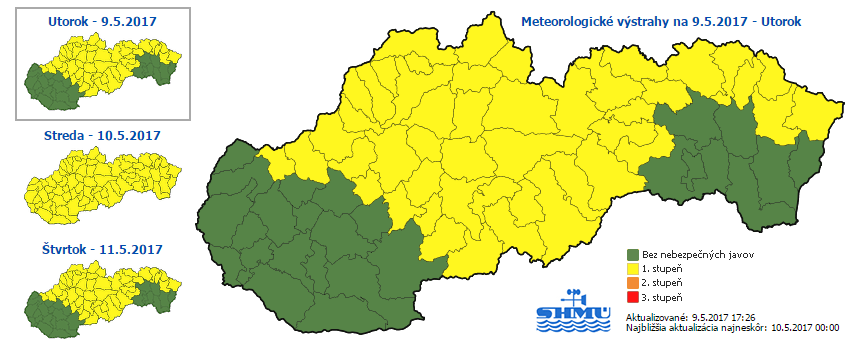 A Szlovák Hidrometeorológiai Intézet előrejelzése szerint 5 centiméterre a talaj felett -1, de egyes járásokban -10 fokos fagy is előfordulhat. Emiatt a ma késő esti órákra elsőfokú riasztás van érvényben alacsony hőmérséklet miatt az ország középső részén, holnap (szerda) hajnalban reggel hét óráig pedig az ország egész területén.