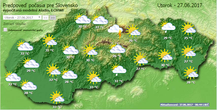 A sok napsütés mellett némi fátyol- és gomolyfelhőzet lehet az égen. Elvétve, főként keleten alakulhat ki zápor, zivatar. Országos hőség lesz, a legmagasabb nappali hőmérséklet 28 és 33 fok között alakul. Árván, Liptón és a Szepességben 26 fokig emelkedhet a hőmérő higanyszála. Gyenge lesz a légmozgás.