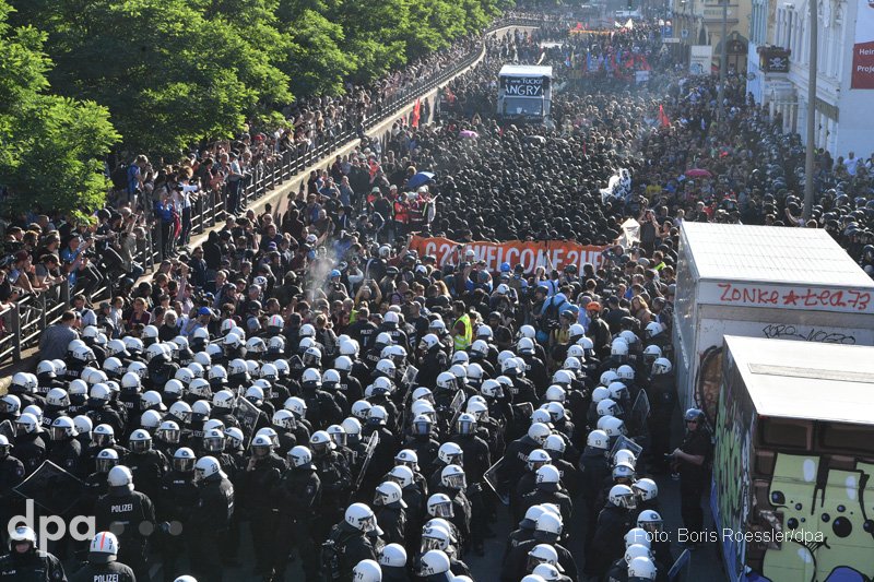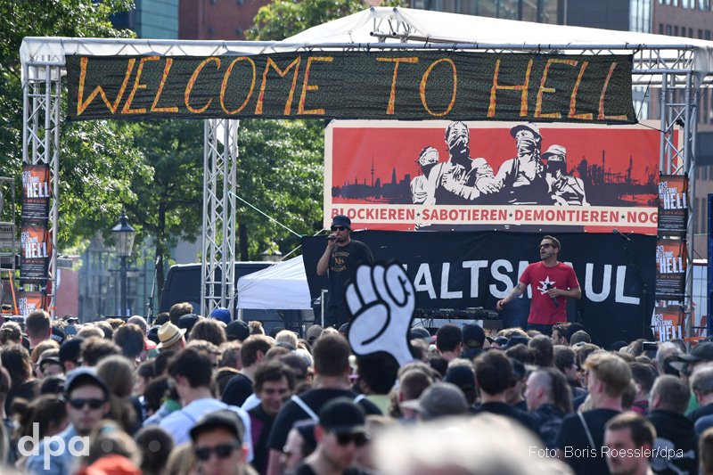 A G20 – Üdv a pokolban (G20 – Welcome to Hell) nevű tüntetés nagyjából egy órán keresztül feszült, de erőszakmentes légkörben zajlott. 20 óra körül azonban a feketébe öltözött, arcukat a német szabályok ellenére eltakaró demonstrálók tűzijátékokat gyújtottak és kövekkel, palackokkal dobálták meg a rohamrendőröket, akik paprikaspray-vel és vízágyúk bevetésével válaszoltak.
