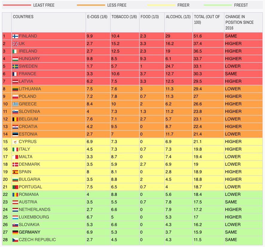 Az IEA (Gazdasági Kapcsolatok Intézete) szabadpiaci agytröszt frissítette a Nanny State Indexet („atyáskodó állam indexe”), amely azt mutatja meg, hogy az EU országaiban mennyire korlátozza az állam az emberek szabad választását az étkezés területén.
