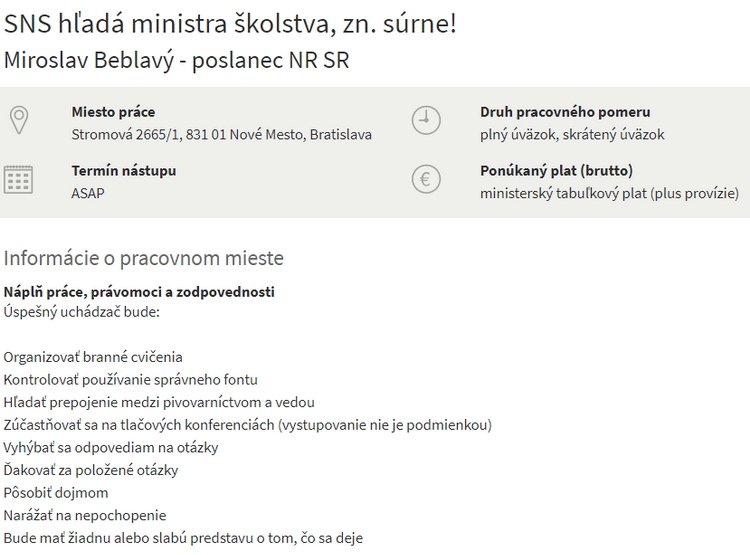 Miroslav Beblavý független parlamenti képviselő sajátos módon próbált segíteni az SNS-nek, hogy megtalálja a megfelelő embert az Oktatásügyi Minisztérium élére. Szlovákia legtöbb álláshirdetését tartalmazó oldalára feltöltött egy állásajánlatot az oktatásügyi miniszter posztjára.