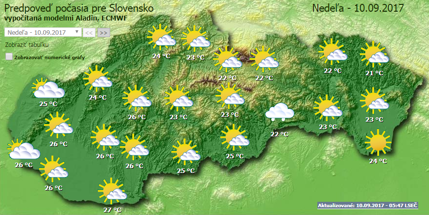 A hét utolsó napján változóan felhős égboltra számíthatunk. A délutáni órákban az ország nyugati részén fokozatosan megnövekszik a felhőzet. Elszórtan záporokra, viharokra lehet számítani. A legmagasabb nappali hőmérséklet 25 és 29 fok között alakul, míg Liptón, Árván, Kiszucán és a Szepességben 23 fokig emelkedik a hőmérő higanyszála. A déli szél megélénkülhet, nyugaton és északon 35–50 km/órás széllökések várhatóak.