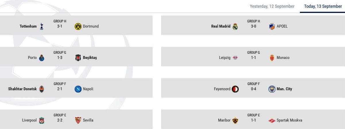 CR dupla és Real siker, Dortmund feletti Spurs siker Londonban, döntetlenező Lipcse Gulácsival, meggyőző City győzelem, négygólos mérkőzést hozó döntetlen a Pool és a Sevilla között, török győzelem Portugáliában, ukrán örömünnep a Napoli ellen, 1-1 gól Mariborban a hazaiak és a vendégek részéről.
