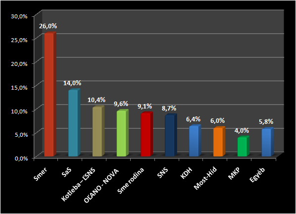 A parlamentbe jutó pártok sorát a Most-Híd zárja 6 százalékkal (0,8 százalékpontot vesztettek), az MKP pedig 4 százalékon áll a Focus szerint (0,5 százalékpontot erősödött).