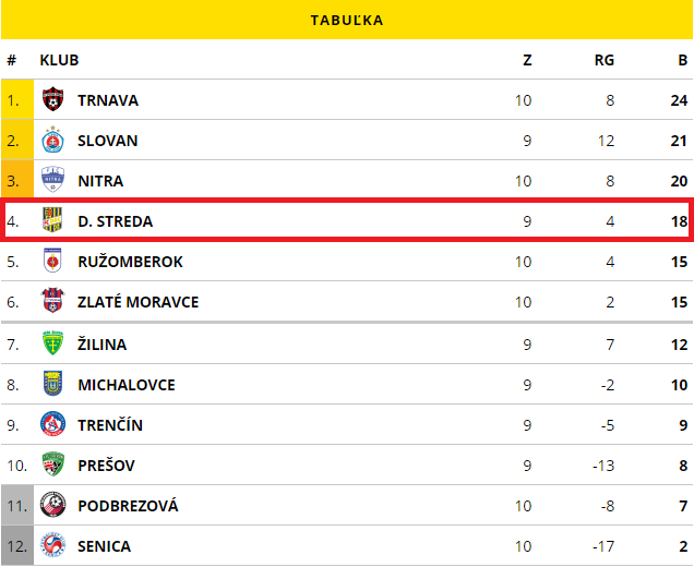 9 forduló után a DAC a tabella negyedik helyén áll, míg a Nagymihály 10 ponttal a nyolcadik. A Fortuna Liga 10. fordulójában már csak 3 találkozó eredményei nem ismertek – ma este mérkőzik a Zsolna a Slovannal valamint a Sároseperjes otthonában fogadja a trencsénieket. A tabella élén jelenleg a nagyszombatiak állnak 24 ponttal (10 mérkőzés után), őket követi a Slovan 21 ponttal, majd a szombaton a rózsahegyiekkel 0:0-s döntetlent játszó Nyitra 20 ponttal.