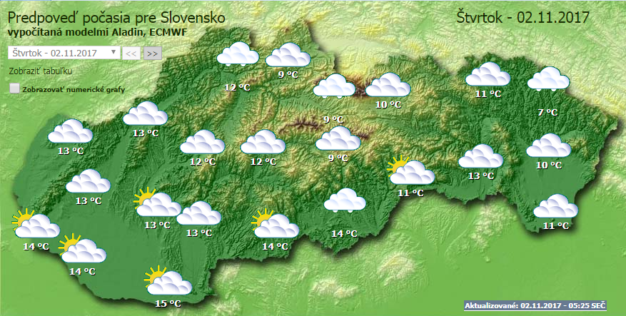 Napközben megnövekszik a felhőzet, de esőre csak az ország keleti és az északi részén számíthatunk az esti órákban. A legmagasabb nappali hőmérséklet 11 és 15 fok között alakul, míg északon 9 fok lesz. A déli és a délnyugati szél többfelé megélénkülhet (20 km/h), ami este Szlovákia délnyugati részén nyugati széllé változik.