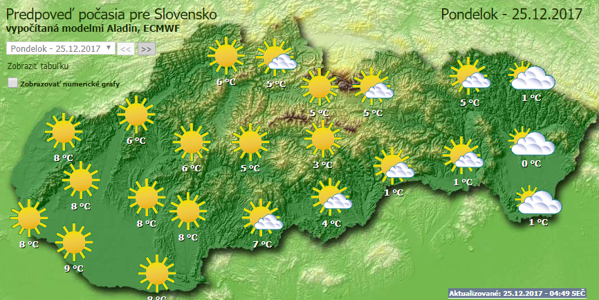 Karácsony első napján gyengén felhős, napos idő várható. Az ország déli részén ködös időre van kilátás, helyenként záporral és zivatarral. A legmagasabb nappali hőmérséklet 4 és 9 fok között alakul. A hegyekben 1500 méter feletti magasságban szintén plusz értékeket mérthetünk, +4 fokot. A nyugati és az északnyugati szél megélénkülhet, sőt, viharossá fokozódhat a magasabban fekvő vidékeken.