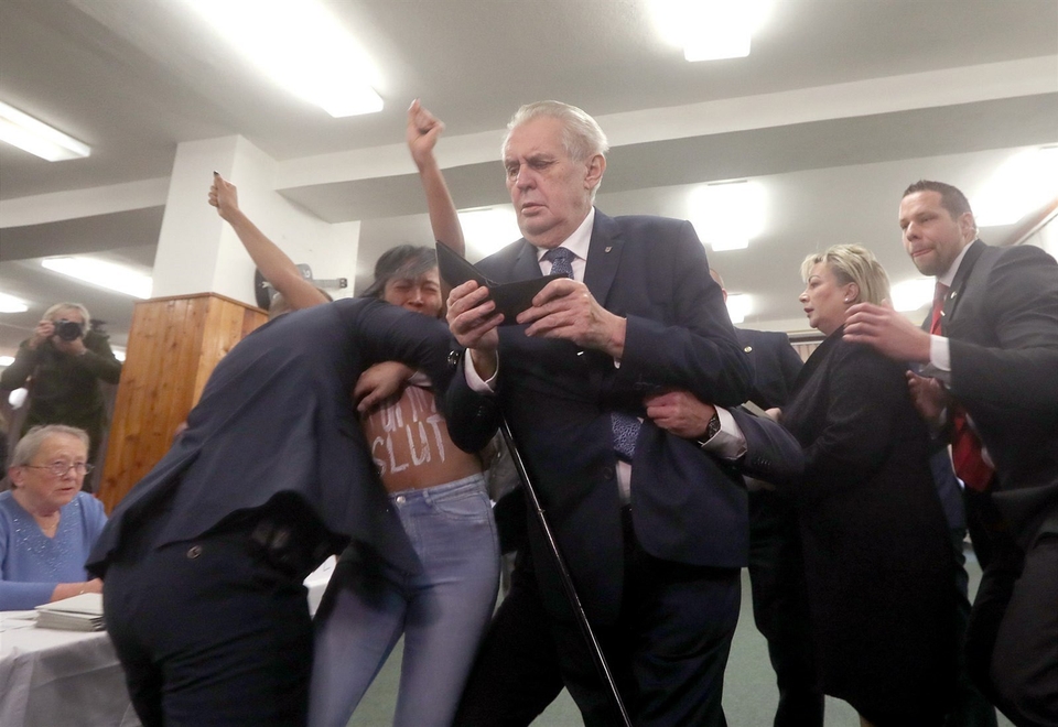Csehországban nem múlhatott el a választási nap egy igazi Miloš Zeman-féle esemény nélkül. A kétnapos szavazás első napján az egyik szavazóhelyiségben, ahol a jelenleg is regnáló köztársasági elnök épp voksoláshoz készülődött, egy fiatal női aktivista ledobta magáról ruhái egy részét, majd rávetette magát Zemanra. A nő célja az volt, hogy megakadályozza az elnököt a szavazásban.