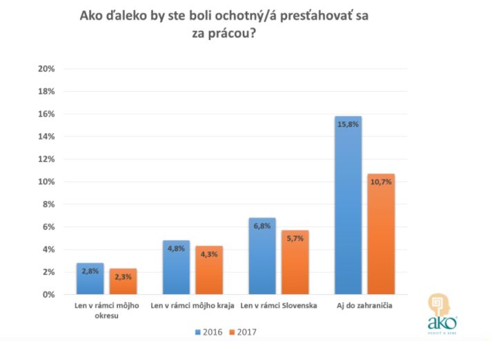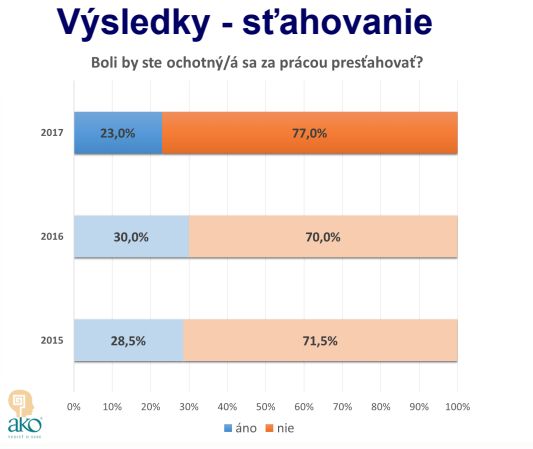Miért lenne hajlandó elköltözni a munkahelyért? 1. lehetőség: azért, hogy munkát kapjak, itt nem találok, 2. lehetőség: Hogy többet keressek, mint most, 3. lehetőség: Hogy új tapasztalatra tegyek szert, 4. lehetőség: Hogy érdekes referenciákat kapjak 5. lehetőség: olcsóbb lakhatáshoz jutnék 6. lehetőség: semmi sem tart itt 7. lehetőség: javulnának az életkörülményeim, forrás: aktuality.sk