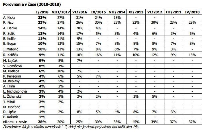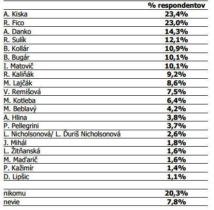 A közvélemény-kutatásból kiderült, hogy továbbra is Andrej Kiska államfő (23,4 százalék) a lemegbízhatóbb politikus az országban a választók körében. Őt szorosan Robert Fico kormányfő (23 százalék), majd messze lemaradva Andrej Danko házelnök (14,3 százalék) követi. A negyedik helyen Richard Sulík (SaS) szerepel (12,1 százalék), az ötödiken Boris Kollár (10,9 százalék).