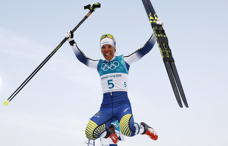 A mezőny nagy része sokáig együtt haladt, a címvédő, hatszoros olimpiai bajnok norvég Marit Björgen öt kilométer után váltott tempót, így a léccserére már csak egy szűkebb, nagyjából húszfős élboly maradt együtt. A szabadstílusú résztávban már a svéd Charlotte Kalla diktálta az iramot, 2,5 kilométerrel a cél előtt „robbantott”, s a tempóváltás után senki nem tudott vele lépést tartani, így összességében simán nyerte meg pályafutása harmadik olimpiai aranyérmét.