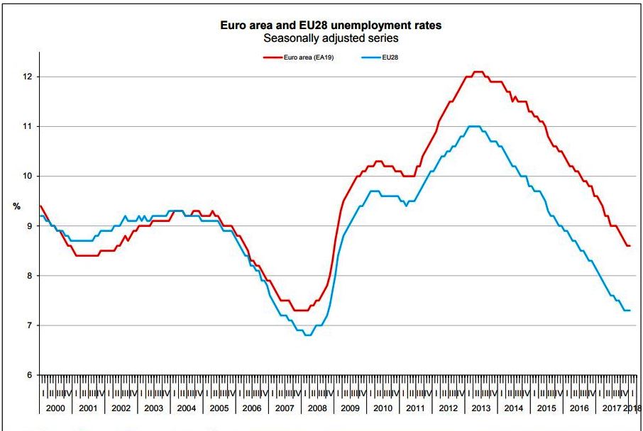 Az euróövezet 19 tagállamában szezonális kiigazítással 8,6 százalék volt a munkanélküliségi ráta az idén januárban, az előző havival megegyező és a legalacsonyabb 2008 decembere óta. Egy évvel korábban, 2017 januárjában 9,6 százalék volt az euróövezeti munkanélküliségi ráta.