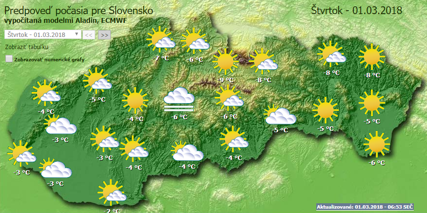 Csütörtökön napos időre ébredhetünk. Az legalacsonyabban fekvő vidékeken megnövekedhet a felhőzet, így havazásra, hószállingózásra lehet számítani. Továbbra is marad a rendkívül hideg időjárás. A legmagasabb nappali hőmérséklet -7 és -2 fok körül alakul, míg Árván, Liptón ész ország északkeleti részén -9 fokig süllyed a hőmérő higanyszála. A hegyekbe 1500 méter feletti magasságban -13 fok lesz. Délnyugaton folyamatosan megerősödhet a délkeleti szél (20 km/h).