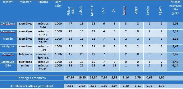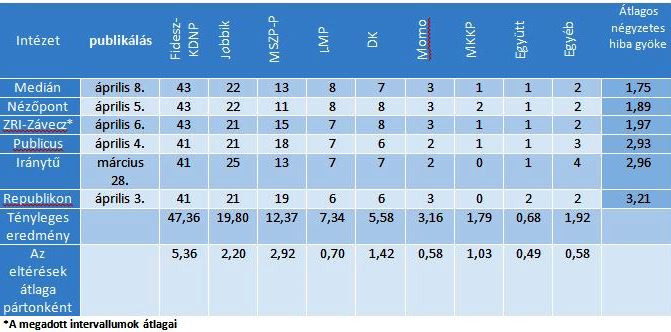 A legpontatlanabb szakmai becslést a Republikon Intézet adta, mely a Fideszt nagyon alá-, az MSZP-Párbeszéd listáját viszont nagyon fölébecsülte, átlagosan 3,21 százalékpontot tévedtek.