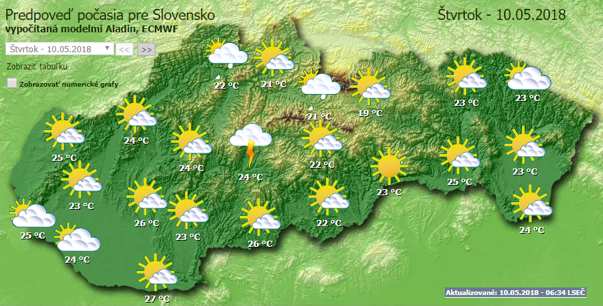 Csütörtökön változóan felhős lesz az ég felettünk. Az ország nyugati részén záporok, zivatarok, intenzív viharok is előfordulhatnak. A legmagasabb nappali hőmérséklet 22 és 27 fok között alakul. A hegyekben 1500 méteres magasságban 13 fok lesz. A reggeli gyenge szél az ország délnyugati részén megélénkülhet (25 km/h), a viharok idején pedig viharossá fokozódhat.