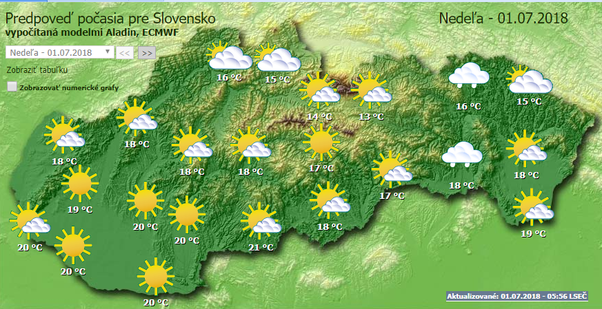 A hét utolsó napján marad a felhős-napos idő, elszórtan azonban megnövekedhet a felhőzet. Főként az ország északi részén lehet számítani záporokra, zivatarokra; a hegyekben, 1900 méteres magasságban havas esősre. A legmagasabb nappali hőmérséklet 18 és 23 fok között alakul, míg Kiszucán, Árván, Liptón és Szepesben 12–17 fokot mérhetünk. Továbbra is marad az északi szél 5–30 km/órás széllökésekkel.